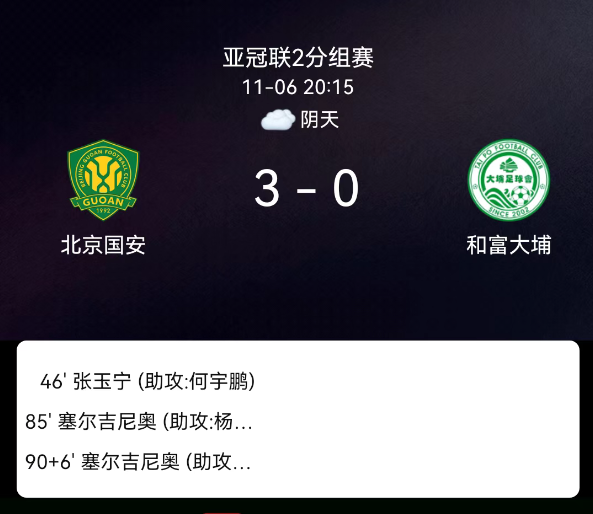 北京时间11月6日,亚足联冠军联赛二级联赛小组赛第4轮,北京国安对阵大埔。第36分钟,何宇鹏吃黄牌;第42分钟,张玉宁与对手各吃一张黄牌;第46分钟,张玉宁破门,国安1-0;第85分钟,塞尔吉尼奥破门,国安2-0;第90+5分钟,塞尔吉尼奥再破门,国安3-0。最终比分,北京国安3-0大埔。