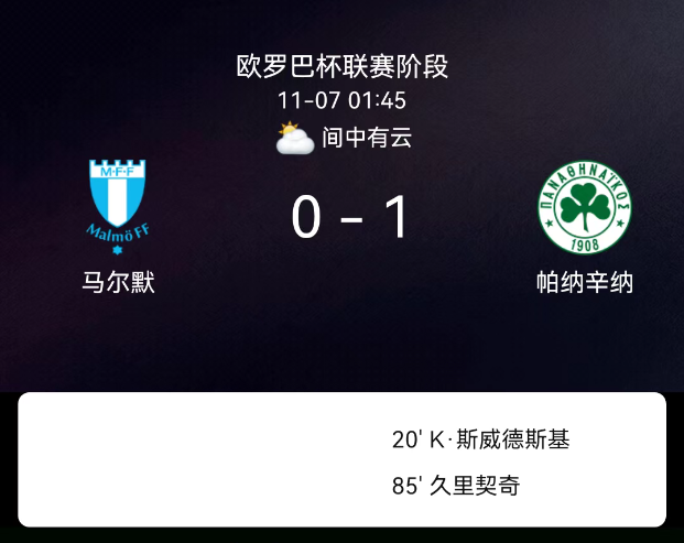 北京时间11月7日,欧足联欧洲联赛第4轮,马尔默主场对阵帕纳辛奈科斯。第20分钟,希维德尔斯基罚丢点球;第56分钟,马尔默吃黄牌;第85分钟,久里契奇破门,帕纳辛奈科斯1-0。最终比分,马尔默0-1帕纳辛奈科斯。