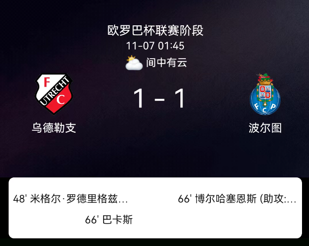 北京时间11月7日,欧足联欧洲联赛第4轮,乌德勒支对阵波尔图。第48分钟,米格尔-罗德里格斯破门,乌德勒支1-0;第66分钟,巴尔卡斯吃红牌,博尔哈-赛恩斯破门,波尔图1-1。最终比分,乌德勒支1-1波尔图。