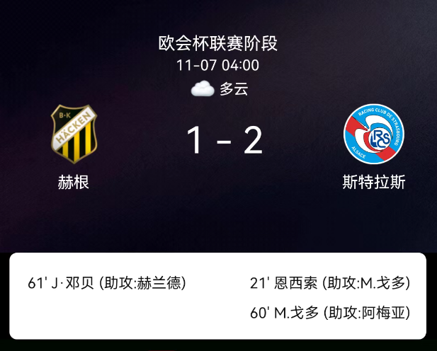 北京时间11月7日,欧洲协会联赛第3轮,赫根对阵斯特拉斯堡。第21分钟,恩西索破门,斯特拉斯堡1-0;第49分钟,赫根吃黄牌;第60分钟,戈多破门,斯特拉斯堡2-0;第61分钟,约翰-保罗-登贝破门,赫根1-2。最终比分,赫根1-2斯特拉斯堡。