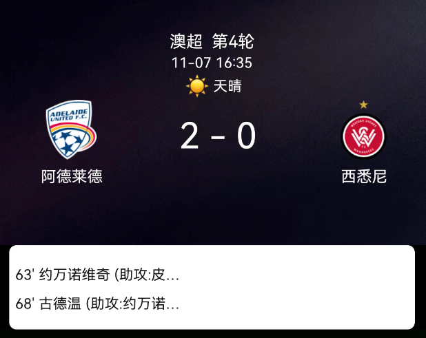 北京时间11月7日,澳大利亚足球超级联赛第4轮,阿德莱德联对阵西悉尼流浪者。第29分钟,阿德莱德联吃黄牌;第31分钟,格尔斯巴赫吃黄牌;第63分钟,卢卡-约万诺维奇破门,阿德莱德联1-0;第68分钟,古德温破门,阿德莱德联2-0;第72分钟,潘塔佐普勒斯吃黄牌。最终比分,阿德莱德联2-0西悉尼流浪者。
