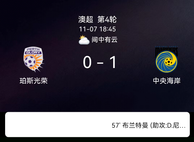 北京时间11月7日,澳大利亚足球超级联赛第4轮,珀斯光荣对阵中央海岸水手。全场无红牌,第28分钟珀斯光荣吃黄牌;第41分钟中央海岸水手吃黄牌;第57分钟勃兰特曼破门,中央海岸水手1-0;第65分钟中央海岸水手再吃黄牌;第89分钟珀斯光荣再吃黄牌。最终比分,珀斯光荣0-1中央海岸水手。