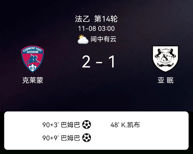 北京时间11月8日,法国足球乙级联赛第14轮,克莱蒙对阵亚眠。第48分钟凯布破门,亚眠1-0;第90+3分钟班巴点球破门,克莱蒙1-1;第90+9分钟班巴再罚入点球,2-1;全场无红黄牌。最终比分,克莱蒙2-1亚眠。