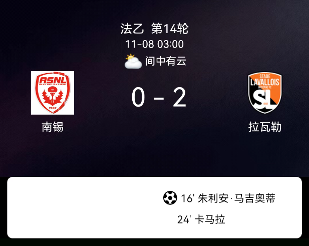 北京时间11月8日,法国足球乙级联赛第14轮,南锡对阵拉瓦勒。第16分钟马焦蒂点球破门,拉瓦勒1-0;第24分钟马马杜-卡马拉破门,2-0;第79分钟南锡吃黄牌。最终比分,南锡0-2拉瓦勒。