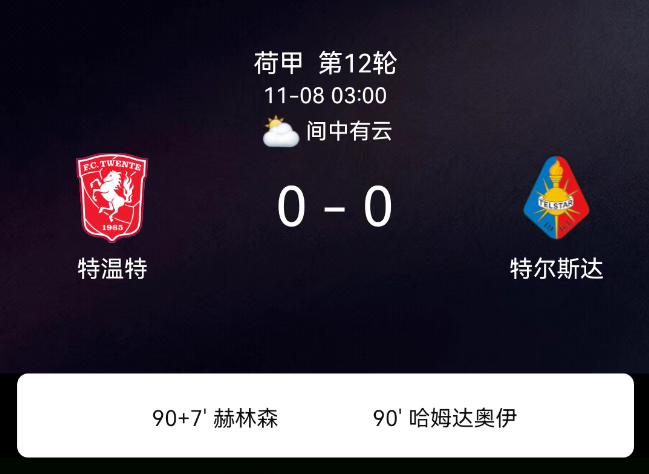 北京时间11月8日,荷兰甲级联赛第12轮,特温特对阵特尔斯达。全场无进球,第90分钟穆罕默德-哈姆达维(特尔斯达)红牌;第90+7分钟赫林松(特温特)两黄变一红。最终比分,特温特0-0特尔斯达。