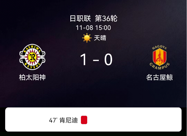 北京时间11月8日,日本职业足球甲级联赛第36轮,柏太阳神对阵名古屋鲸鱼。第33分钟名古屋鲸鱼吃黄牌;第47分钟三国-肯尼迪-埃格布斯自摆乌龙,柏太阳神1-0;全场无红牌。最终比分,柏太阳神1-0名古屋鲸鱼。