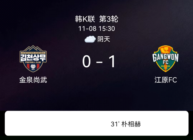 北京时间11月8日,韩国经典K联赛争冠组第3轮,金泉尚武对阵江原。第22分钟金泉尚武吃黄牌;第31分钟朴相赫破门,江原1-0;第76分钟江原吃黄牌;全场无红牌。最终比分,金泉尚武0-1江原。