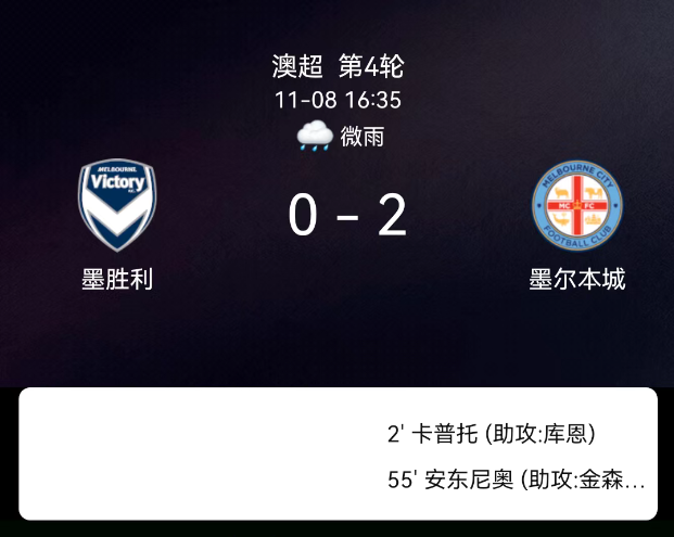 北京时间11月8日,澳大利亚足球超级联赛第4轮,墨尔本胜利对阵墨尔本城。第2分钟卡普托破门,墨尔本城1-0;第39分钟墨尔本胜利吃黄牌;第55分钟彼得-安东尼乌破门,2-0;全场无红牌。最终比分,墨尔本胜利0-2墨尔本城。