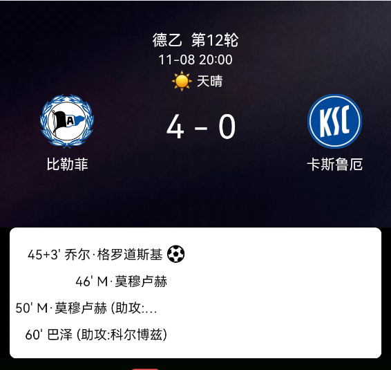 北京时间11月8日,德国足球乙级联赛第12轮,比勒费尔德对阵卡尔斯鲁厄。第45+3分钟格罗多夫斯基点球破门,比勒费尔德1-0;第46分钟莫穆卢赫破门,2-0;第50分钟莫穆卢赫再破门,3-0;第60分钟萨伦伦-巴泽破门,4-0;卡尔斯鲁厄获2张黄牌,全场无红牌。最终比分,比勒费尔德4-0卡尔斯鲁厄。