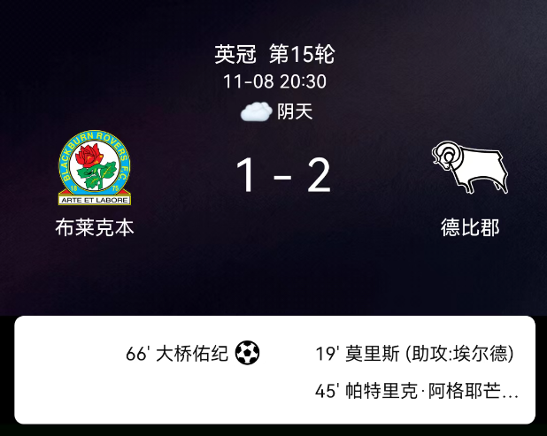 北京时间11月8日,英格兰足球冠军联赛第15轮,布莱克本对阵德比郡。第19分钟卡尔顿-莫里斯破门,德比郡1-0;第35分钟布莱克本吃黄牌;第45分钟帕特里克-阿杰芒破门,2-0;第66分钟大桥祐纪点球破门,1-2;全场无红牌。最终比分,布莱克本流浪者1-2德比郡。