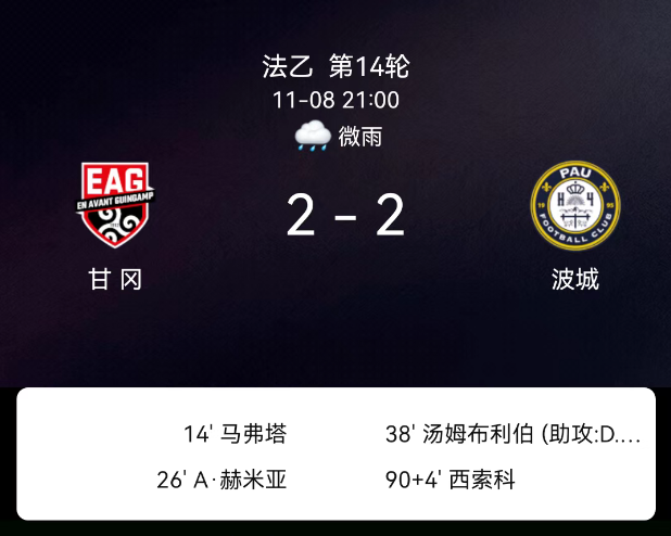 北京时间11月8日,法国足球乙级联赛第14轮,甘冈对阵波城。第14分钟马福塔破门,甘冈1-0;第26分钟AmineHemia破门,2-0;第38分钟普伊破门,波城1-2;第51分钟甘冈吃黄牌;第90+4分钟奥马尔-西索科破门,2-2;全场无红牌。最终比分,甘冈2-2波城。