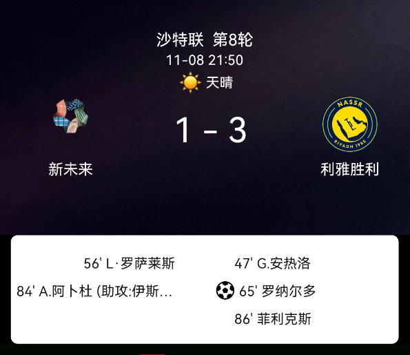 北京时间11月8日,沙特阿拉伯联赛第8轮,新未来城体育对阵利雅得胜利。第6分钟新未来城体育吃黄牌;第33分钟利雅得胜利吃黄牌;第47分钟安热洛-博尔热斯破门,1-0;第55分钟卢西亚诺-罗德里格斯直红罚下;第65分钟C罗点射,2-0;第84分钟艾哈迈德-阿卜杜破门,1-2;第86分钟菲利克斯世界波,3-1。最终比分,新未来城体育1-3利雅得胜利。