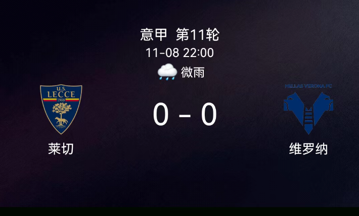 北京时间11月8日,意大利足球甲级联赛第11轮,莱切对阵维罗纳。全场无进球,莱切获1张黄牌、维罗纳获2张黄牌,无红牌。最终比分,莱切0-0维罗纳。