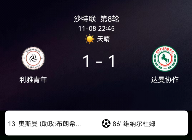 北京时间11月8日,沙特职业足球联赛第8轮,利雅得青年对阵达曼协作。第13分钟阿卜杜勒阿齐兹-奥斯曼破门,1-0;第62分钟达曼协作吃黄牌;第86分钟威纳尔杜姆点球破门,1-1;全场无红牌。最终比分,利雅得青年1-1达曼协作。