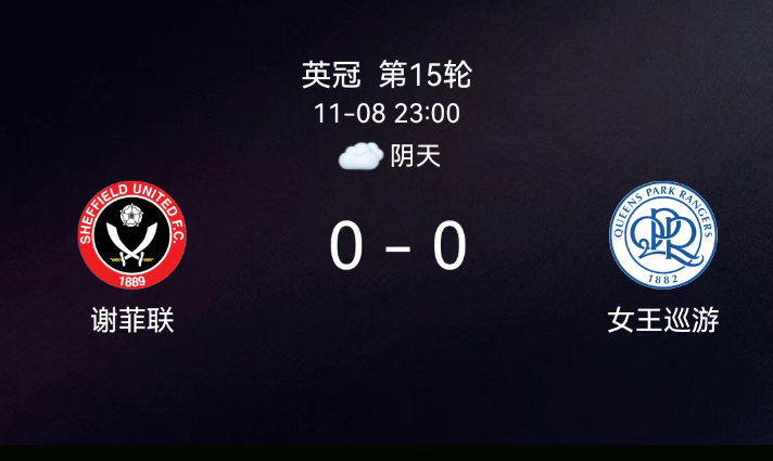 北京时间11月8日,英格兰足球冠军联赛第15轮,谢菲尔德联对阵女王公园巡游者。全场无进球,谢菲尔德联获1张黄牌、女王公园巡游者获2张黄牌,无红牌。最终比分,谢菲尔德联0-0女王公园巡游者。