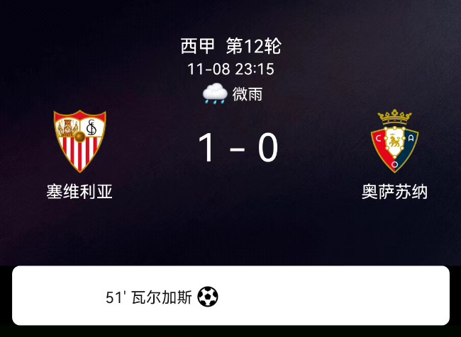 北京时间11月8日,西班牙足球甲级联赛第12轮,塞维利亚对阵奥萨苏纳。第20分钟塞维利亚吃黄牌;第21分钟奥萨苏纳吃黄牌;第51分钟鲁文-巴尔加斯点球破门,1-0;全场共8张黄牌、无红牌。最终比分,塞维利亚1-0奥萨苏纳。
