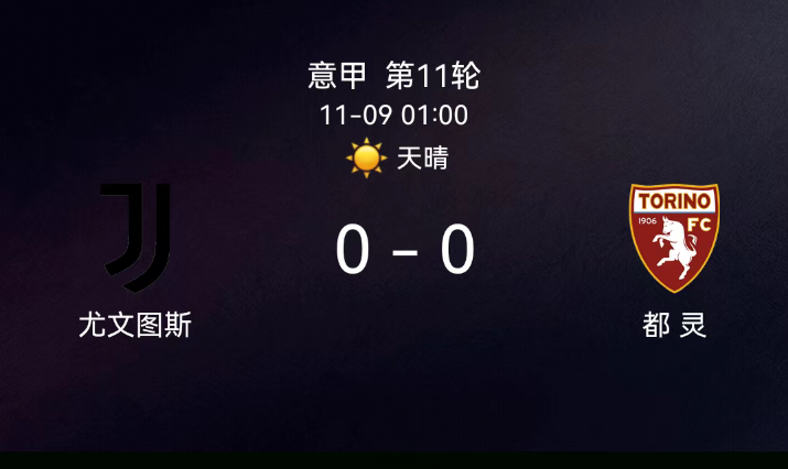 北京时间11月9日,意大利足球甲级联赛第11轮,尤文图斯对阵都灵。全场无进球,第64分钟都灵获1张黄牌,无红牌。最终比分,尤文图斯0-0都灵。