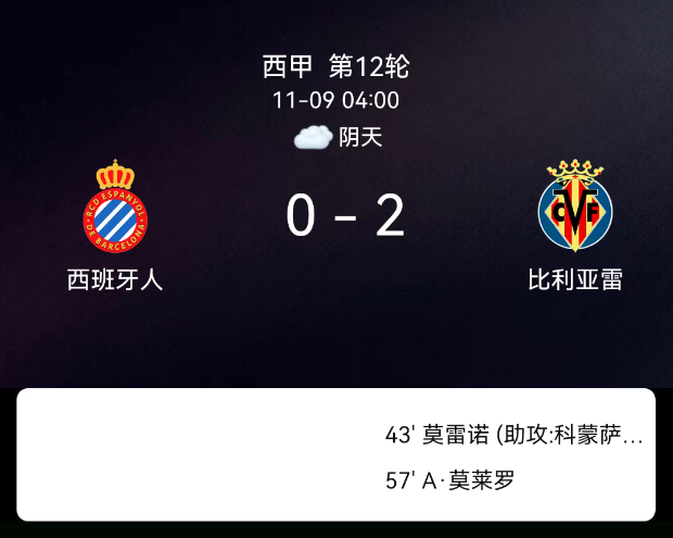 北京时间11月9日,西班牙足球甲级联赛第12轮,西班牙人对阵比利亚雷亚尔。第43分钟赫拉德-莫雷诺破门,1-0;第57分钟莫莱罗补射破门,2-0;第81分钟纳瓦罗吃黄牌;全场无红牌。最终比分,西班牙人0-2比利亚雷亚尔。