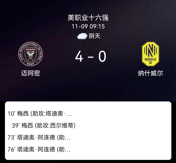 北京时间11月9日,美职联季后赛1/8决赛第三局,迈阿密国际对阵纳什维尔。第11分钟梅西破门,1-0;第39分钟梅西再破门,2-0;第45+1分钟齐默尔曼吃黄牌;第67分钟马厄吃黄牌;第73分钟阿连德破门,3-0;第76分钟阿连德再破门,4-0;全场无红牌。最终比分,迈阿密国际4-0纳什维尔,总比分2-1晋级八强。