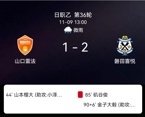 北京时间11月9日,日本职业联赛J2第36轮,山口雷法对阵磐田喜悦。第44分钟山本樱大破门,1-0;第86分钟矶谷骏乌龙,1-1;第90+6分钟金子大毅破门,2-1;全场无红黄牌。最终比分,山口雷法1-2磐田喜悦。