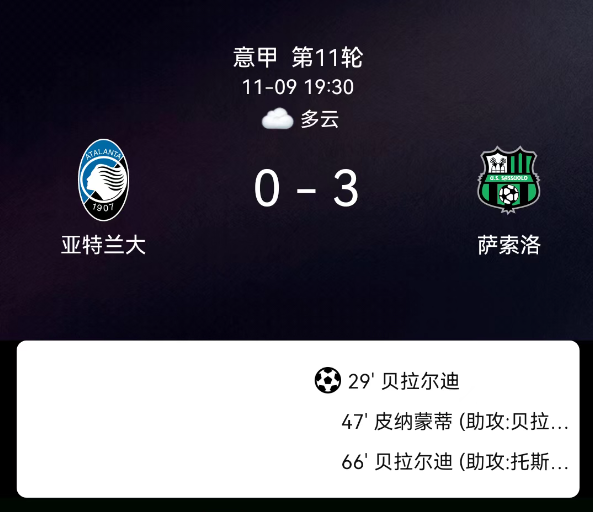 北京时间11月9日,意大利足球顶级联赛第11轮,亚特兰大对阵萨索洛。第29分钟贝拉尔迪点球破门,1-0;第47分钟皮纳蒙蒂破门,2-0;第67分钟贝拉尔迪再破门,3-0;全场无红黄牌。最终比分,亚特兰大0-3萨索洛,亚特兰大遭遇联赛7轮不胜。