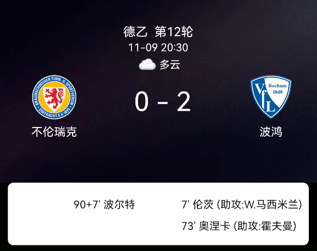 北京时间11月9日,德国足球乙级联赛第12轮,布伦瑞克对阵波鸿。第7分钟CajetanLenz破门,1-0;第73分钟弗朗西斯-奥涅卡破门,2-0;全场无红黄牌。最终比分,布伦瑞克0-2波鸿。