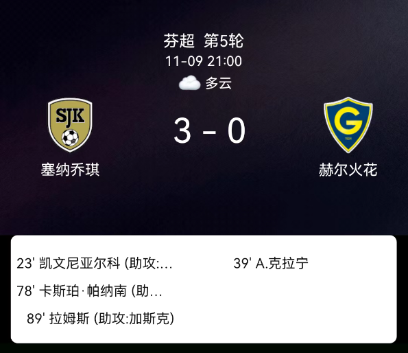 北京时间11月9日,芬兰足球超级联赛争冠组第5轮,塞纳乔琪对阵赫尔火花。第23分钟KevinAppiahNyarko破门,1-0;第39分钟克兰尼克斯吃红牌;第78分钟KasperPaananen破门,2-0;第89分钟卡尔亚莱宁破门,3-0;全场无黄牌。最终比分,塞纳乔琪3-0赫尔火花。