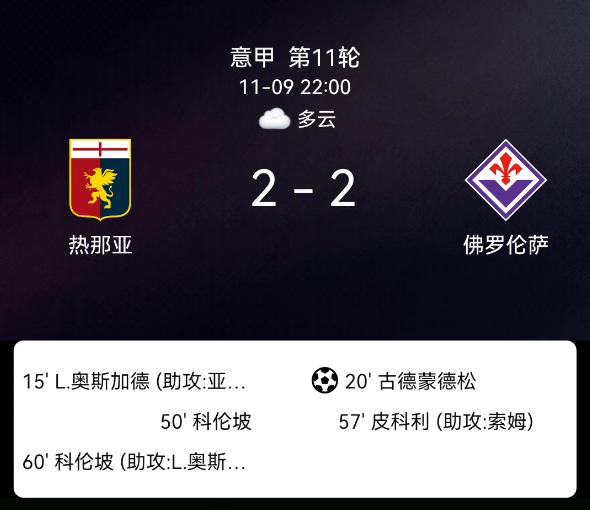 北京时间11月9日,意甲第11轮,热那亚对阵佛罗伦萨。第15分钟厄斯蒂高破门,1-0;第19分钟古德蒙德松点球破门,1-1;第57分钟皮科利破门,2-1;第60分钟科隆博破门,2-2;全场无红黄牌。最终比分,热那亚2-2佛罗伦萨。