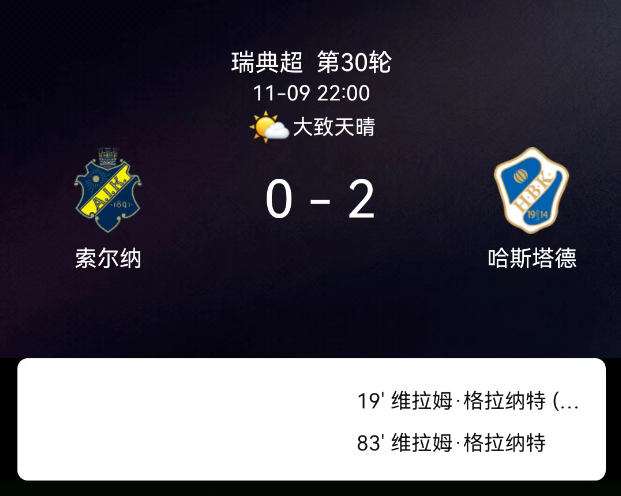 北京时间11月9日,瑞典足球超级联赛第30轮,AIK索尔纳对阵哈尔姆斯塔德。第19分钟威廉-格拉纳特破门,1-0;第83分钟威廉-格拉纳特再破门,2-0;全场无红黄牌。最终比分,AIK索尔纳0-2哈尔姆斯塔德。