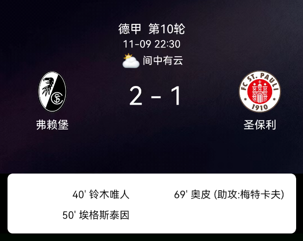 北京时间11月9日,2024-2025赛季德甲第10轮,弗赖堡对阵圣保利。第40分钟铃木唯人破门,1-0;第50分钟马克西米利安-埃格施泰因破门,2-0;第69分钟奥皮耶破门,2-1;全场无红黄牌。最终比分,弗赖堡2-1圣保利。