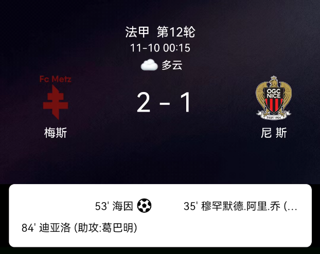 北京时间11月10日,法甲联赛第12轮,梅斯对阵尼斯。第35分钟穆罕默德-阿里-肖破门,1-0;第53分钟艾因点球破门,1-1;第84分钟哈比卜-迪亚洛破门,2-1;全场无红黄牌。最终比分,梅斯2-1尼斯。