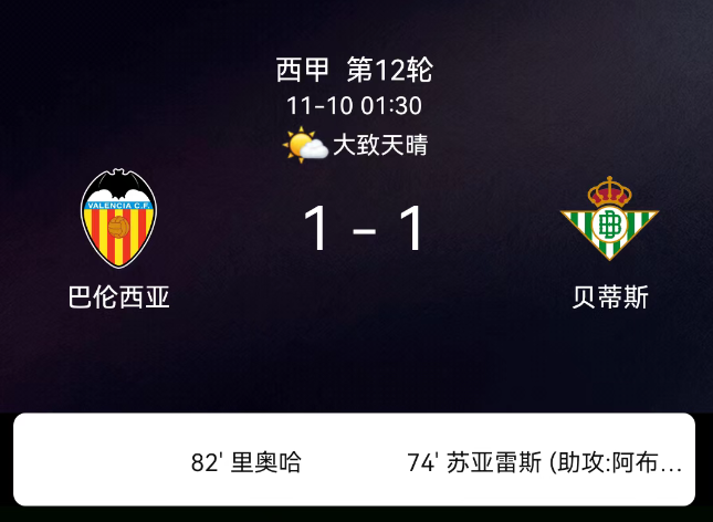 北京时间11月10日,西班牙足球甲级联赛第12轮,瓦伦西亚对阵皇家贝蒂斯。第74分钟库乔-埃尔南德斯破门,1-0;第82分钟里奥哈破门,1-1;加亚领到一张黄牌,全场无红牌。最终比分,瓦伦西亚1-1皇家贝蒂斯。