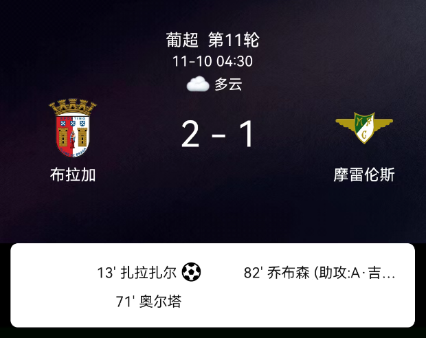 北京时间11月10日,葡萄牙足球超级联赛第11轮,布拉加对阵莫雷拉人。第13分钟萨拉萨尔点球破门,1-0;第71分钟里卡多-奥尔塔破门,2-0;第82分钟马拉卡斯破门,2-1;全场无红黄牌。最终比分,布拉加2-1莫雷拉人。