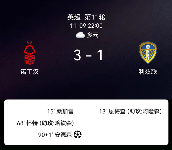 北京时间11月9日,英格兰足球超级联赛第11轮,诺丁汉森林对阵利兹联。第13分钟卢卡斯-恩梅加破门,1-0;第15分钟桑加雷破门,1-1;第68分钟吉布斯-怀特破门,2-1;第70分钟朗斯塔夫吃黄牌;第90分钟埃利奥特-安德森点球破门,3-1;全场无红牌。最终比分,诺丁汉森林3-1利兹联,终结连续9轮不胜。