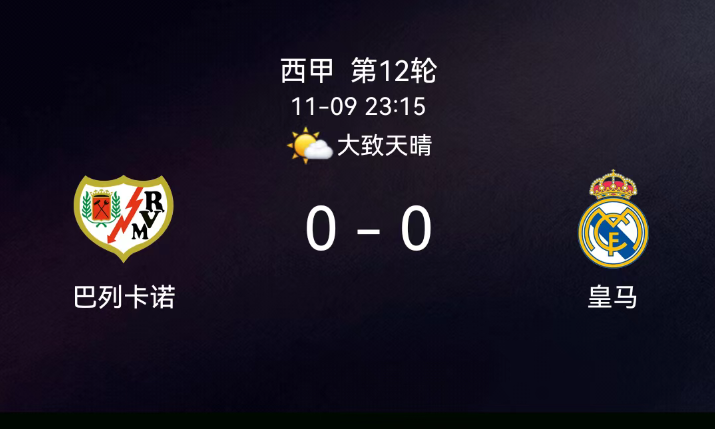 北京时间11月9日,西班牙足球甲级联赛第12轮,巴列卡诺对阵皇家马德里。第14分钟拉蒂乌吃黄牌;第34分钟阿尔瓦罗-加西亚吃黄牌;全场无进球、无红牌。最终比分,巴列卡诺0-0皇家马德里。