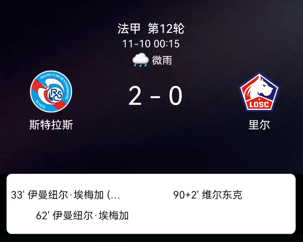 北京时间11月10日,法甲联赛第12轮,斯特拉斯堡对阵里尔。第33分钟埃梅加破门,1-0;第62分钟埃梅加再破门,2-0;第65分钟罗塞尼尔两黄变一红;补时第3分钟维尔东克吃红牌。最终比分,斯特拉斯堡2-0里尔。