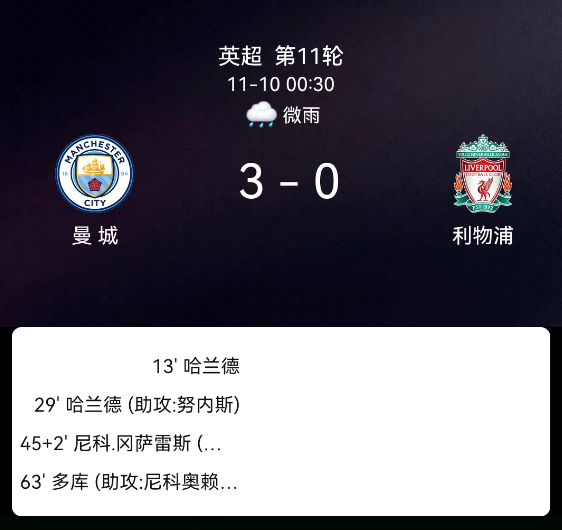 北京时间11月10日,英格兰足球超级联赛第11轮,曼城对阵利物浦。第28分钟哈兰德头球破门,1-0;第45+3分钟尼科-冈萨雷斯折射破门,2-0;第62分钟多库世界波破门,3-0;尼科-冈萨雷斯、麦卡利斯特、B席、琼斯、索博斯洛伊各领一黄。最终比分,曼城3-0利物浦。