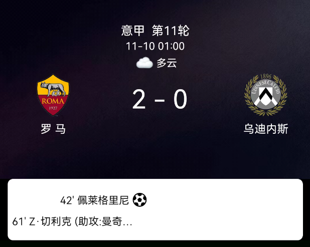 北京时间11月10日,意大利足球顶级联赛第11轮,罗马对阵乌迪内斯。第42分钟洛伦佐-佩莱格里尼点球破门,1-0;第61分钟切利克破门,2-0;全场无红黄牌。最终比分,罗马2-0乌迪内斯。
