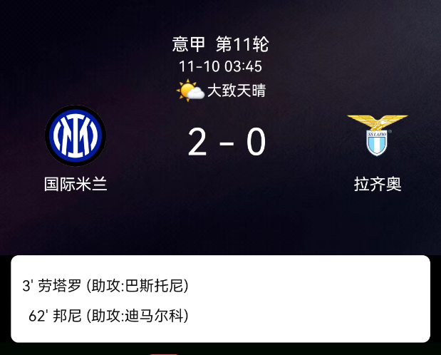 北京时间11月10日,意大利足球顶级联赛第11轮,国际米兰对阵拉齐奥。第3分钟劳塔罗抽射破门,1-0;第61分钟博尼推射破门,2-0;阿坎吉、邓弗里斯、萨里各领一黄,全场无红牌。最终比分,国际米兰2-0拉齐奥。