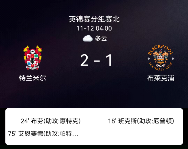 北京时间11月12日,英格兰联赛锦标赛小组赛北,特兰米尔对阵布莱克浦。第18分钟斯科特-班克斯破门,1-0;第24分钟布罗破门,1-1;第75分钟艾恩赛德破门,2-1;全场无红黄牌。最终比分,特兰米尔2-1布莱克浦。