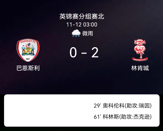 北京时间11月12日,英格兰联赛锦标赛小组赛北,巴恩斯利对阵林肯城。第29分钟奥科龙库沃破门,1-0;第61分钟詹姆斯-科林斯破门,2-0;全场无红黄牌。最终比分,巴恩斯利0-2林肯城。