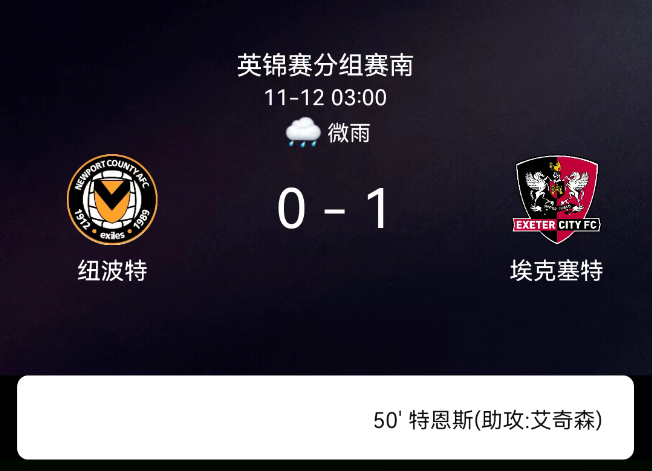 北京时间11月12日,英格兰联赛锦标赛小组赛南,纽波特对阵埃克塞特城。第50分钟图恩斯破门,1-0;全场无红黄牌。最终比分,纽波特0-1埃克塞特城。