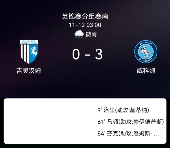 北京时间11月12日,英格兰联赛锦标赛小组赛南区,吉灵汉姆对阵威科姆。第9分钟劳里破门,1-0;第61分钟杰克-马东破门,2-0;第84分钟芬克破门,3-0;全场无红黄牌。最终比分,吉灵汉姆0-3威科姆。