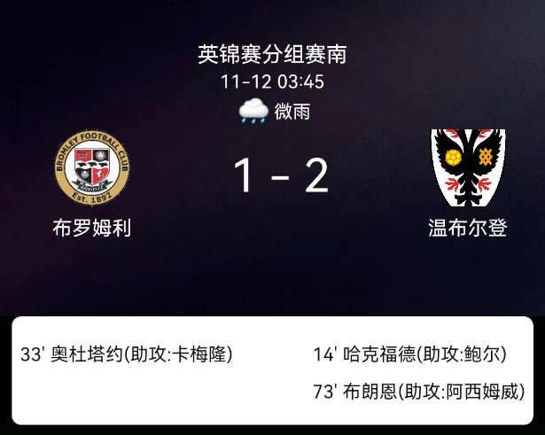 北京时间11月12日,英格兰联赛锦标赛小组赛南,布罗姆利对阵AFC温布尔登。第14分钟哈克福德破门,1-0;第33分钟奥杜塔约破门,1-1;第73分钟马库斯-布朗破门,2-1;全场无红黄牌。最终比分,布罗姆利1-2AFC温布尔登。
