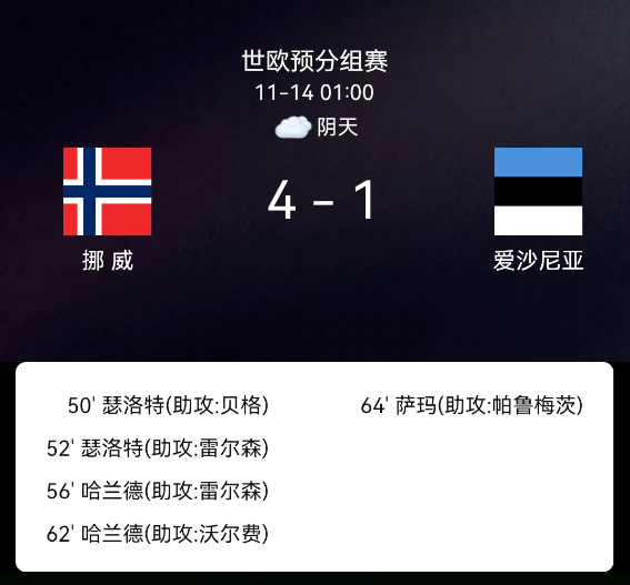 北京时间11月14日,2026年世界杯欧洲区预选赛第一阶段小组赛第9轮,挪威对阵爱沙尼亚。第50分钟瑟洛特头球破门,1-0;第52分钟瑟洛特再头球破门,2-0;第56分钟哈兰德头球破门,3-0;第62分钟哈兰德爆射破门,4-0;第65分钟罗比-萨尔马破门,4-1;全场无红黄牌。最终比分,挪威4-1爱沙尼亚。