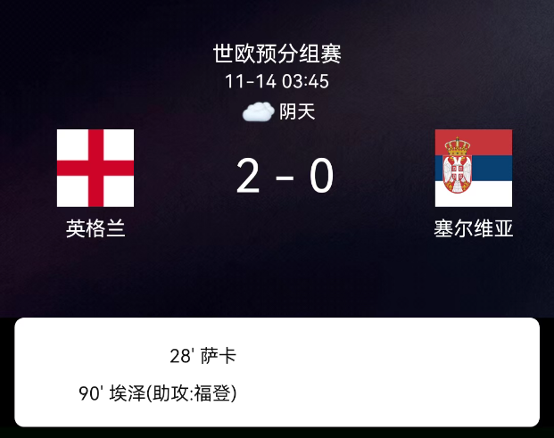 北京时间11月14日,世界杯欧洲区预选赛第一阶段小组赛第9轮,英格兰对阵塞尔维亚。第28分钟萨卡垫射破门,1-0;第85分钟塞尔维亚球员染黄;第90分钟埃泽兜射破门,2-0;英格兰无黄牌记录,无红牌。最终比分,英格兰2-0塞尔维亚。