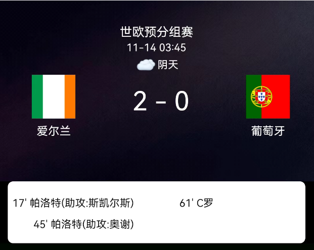 北京时间11月14日,2026年世界杯欧洲区预选赛第一阶段小组赛第9轮,爱尔兰对阵葡萄牙。第18分钟帕罗特头球破门,1-0;第45分钟帕罗特低射破门,2-0;第63分钟C罗肘击染红;无其他红黄牌。最终比分,爱尔兰2-0葡萄牙。