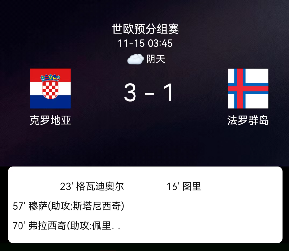 北京时间11月15日,世界杯欧洲区预选赛第一阶段小组赛第9轮,克罗地亚对阵法罗群岛。第16分钟图里折射破门,1-0;第23分钟格瓦迪奥尔补射破门,1-1;第57分钟穆萨插上破门,2-1;第70分钟弗拉希奇后点破门,3-1;全场无红黄牌。最终比分,克罗地亚3-1法罗群岛。
