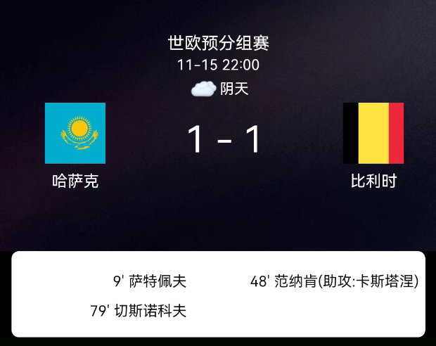 北京时间11月15日,2026年世界杯欧洲区预选赛第一阶段小组赛第9轮,哈萨克斯坦对阵比利时。第9分钟萨特帕耶夫小角度破门,1-0;第48分钟瓦纳肯头球破门,1-1;第79分钟切斯诺科夫染红;全场无黄牌记录。最终比分,哈萨克斯坦1-1比利时。