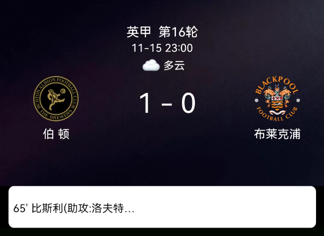 北京时间11月15日,英格兰足球甲级联赛第16轮,伯顿主场对阵布莱克浦。第57分钟布莱克浦球员染黄;第65分钟卡尔斯维尔破门,1-0;全场共7张黄牌,伯顿2张、布莱克浦5张;无红牌。最终比分,伯顿1-0布莱克浦。
